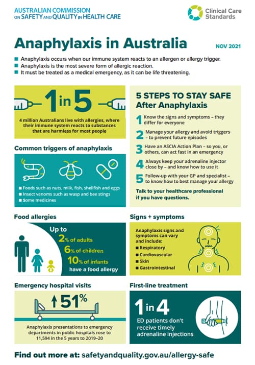 Visit the Australian Commission on Safety and Quality in Health Care website for more information about the Acute Anaphylaxis Clinical Care Standard.