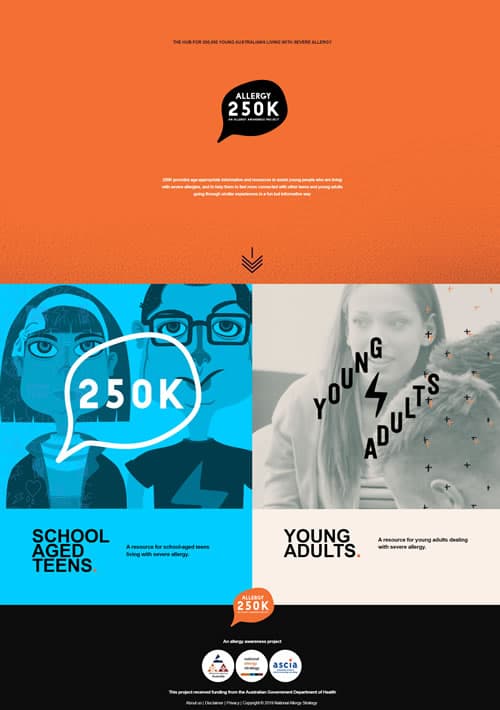 The Allergy 250K homepage provides the option to visit the Allergy 250K school-aged teens website or the Allergy 250K young adults website.